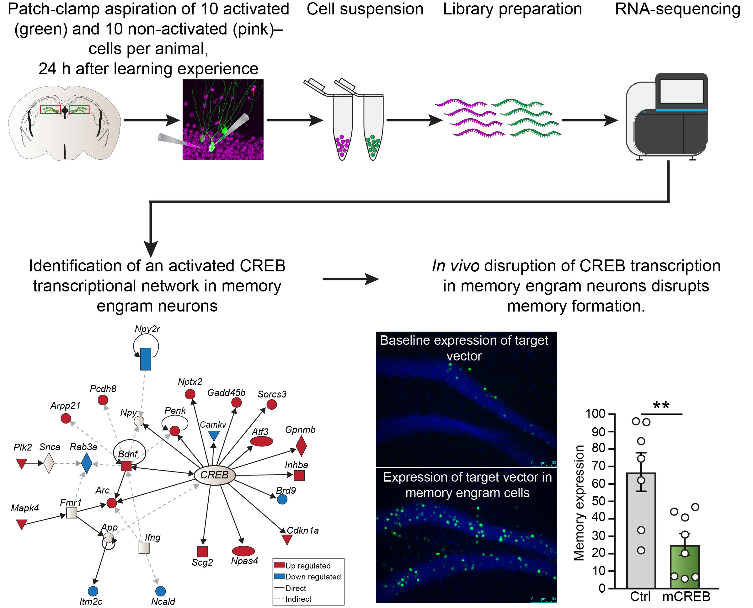 To tackle this issue, researches used activity-dependent transgenic reporter mice in combination with in vivo miniature microendoscopy to express a fluorescent tag in neurons activated by a specific learning experience (fear conditioning) and visualize them over time. A novel and sensitive method of fluorescence-guided cell aspiration was then used to harvest and selectively isolate the content of 10 activated hippocampal neurons for sensitive RNA-sequencing. A comparison between the molecular profile of memory engram neurons and their non-activated neighbors 24 h after a learning experience revealed enduring molecular modifications specific to memory consolidation. In particular, a network of genes whose expression is modulated by a multifaceted regulator of gene expression (i.e. CREB), featured prominently. Finally, the functional relevance of these changes in gene expression was confirmed by engram-specific disruption of the identified CREB gene network using a novel viral vector designed by the team of Michel van den Oever. This targeted in vivo manipulation resulted in a profound deficit in memory storage and its subsequent expression.
