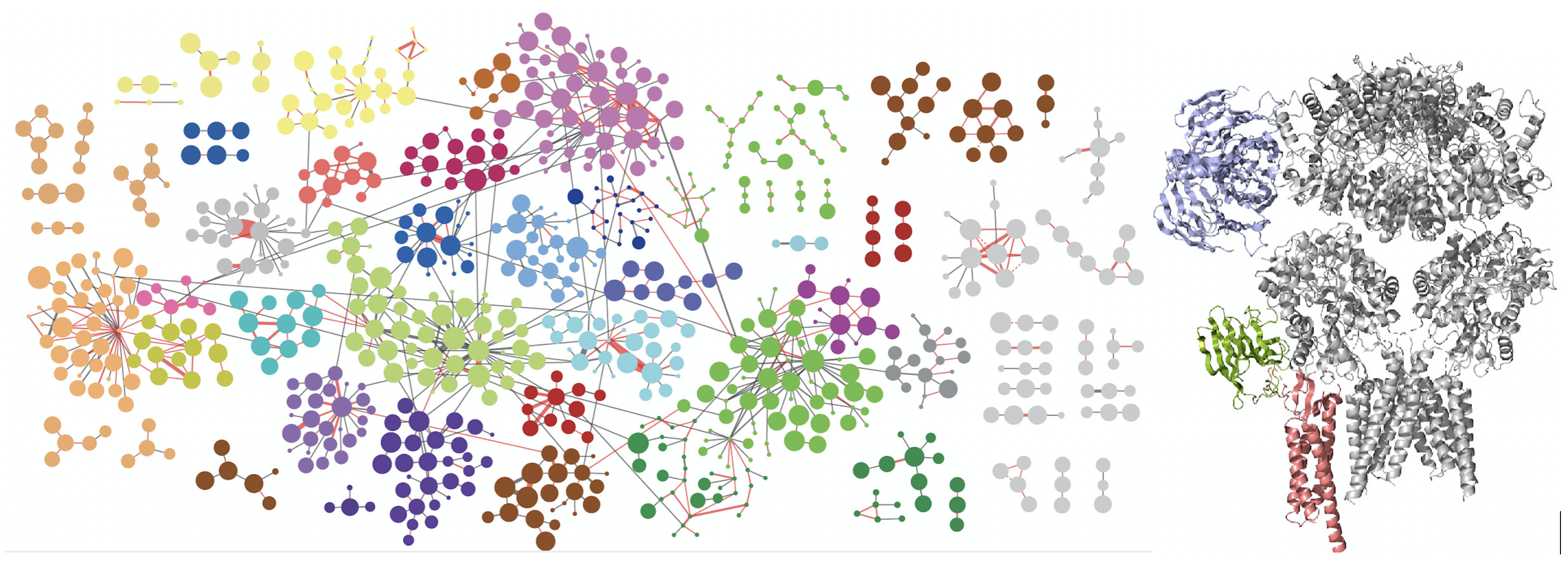 Left figure: The network of interacting synaptic proteins as visualized through crosslinking mass spectrometry. Right figure: three interacting proteins (colored) of the AMPA receptor positioned onto the AMPAR 3D structure based on the crosslinking data.